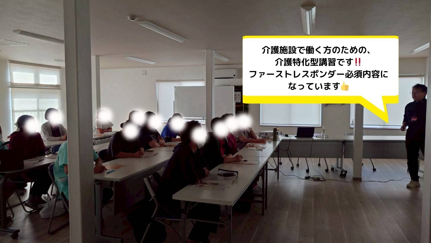 座学講義のパートについては、頷きながら聞いておられる姿も多数見受けられ、話す方としても話しやすい環境の中、最近の介護業界や救急医療の実態などもお話させて頂きました。