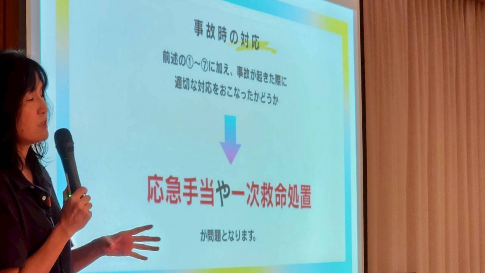 実際に起きた事故対応を伺いながら、一次救命処置に必要な情報のアップデートになるような情報もお伝えしました。